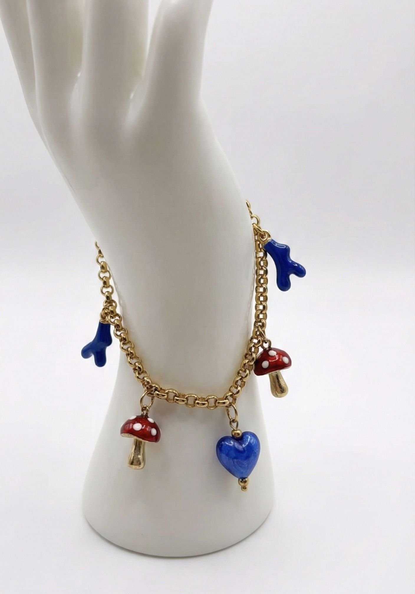 • Composition des charms : Champignons (Émail rouge/blanc), Cœurs (Pierre reconstituée ou Verre bleu), Branches (Corail bleu).