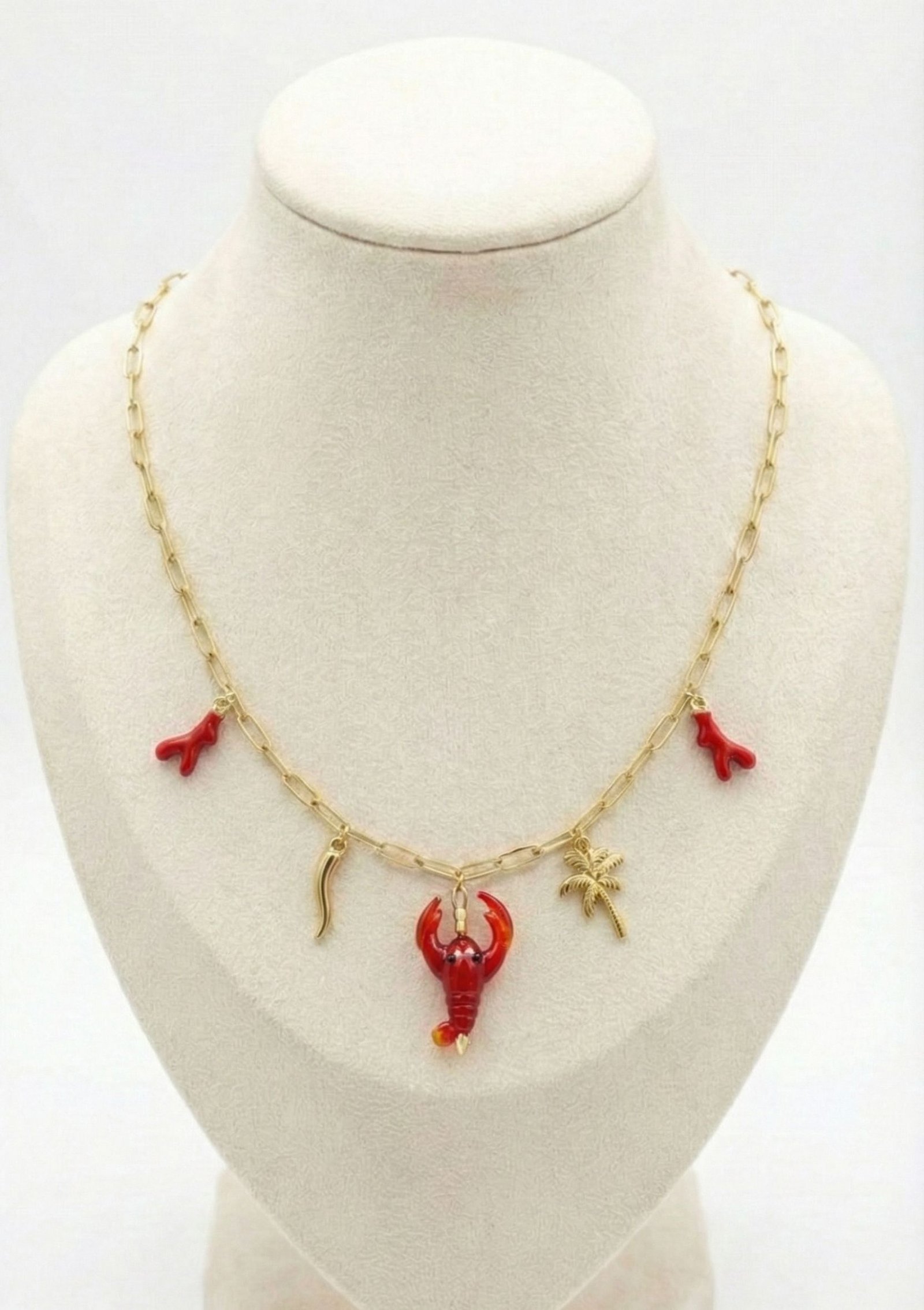 • L’audace : Le homard central et les branches de corail, réalisés en émail rouge vibrant, créent un contraste saisissant avec les charms dorés (piment et palmier) pour un style qui ne passe jamais inaperçu